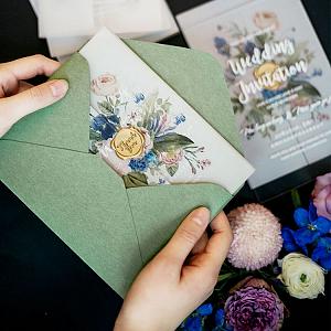 Crash on this watercolor acrylic wedding invite featuring green hues.
