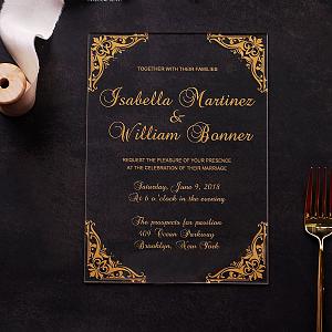 Vintage formal black and gold acrylic wedding invitations for fall and winter