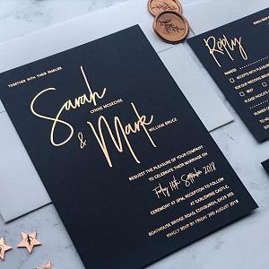 Gold and black are perfectly matched in this metallic invitation set.