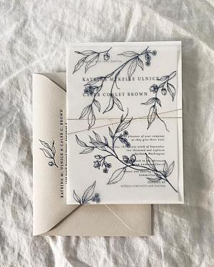 Natural minimal clear acrylic wedding invitations with foil detaisl.