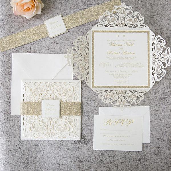 Romantic White Ivory Laser Cut Wedding Invitations with Gold Glitter Belly Band, spring, fall, winter,...