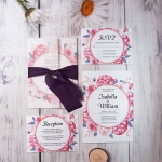 Very bright pink watercolor wedding invite features floral crown with clear vellum wrap. The color of ribbon can change to any other option. Choose this invite for your spring Boho wedding theme.