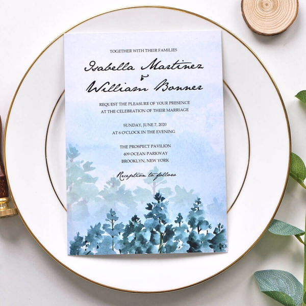 Crazy about elopement wedding? Choose this mysterious mountain wedding invite featuring watercolor trees. Printed on luxe paper with exquisite craft, ensure the 100% color clear.
