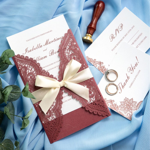 Burgundy Floral Laser Cut Wedding Invitations with Gold Ribbon, Vintage Fall Wedding Invitations, Elegant Wedding Invitations WS006