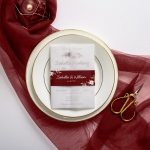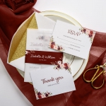 This elegant wedding invitation features white vellum wrap accented with burgundy belly band and floral pattern scattered around the corner.