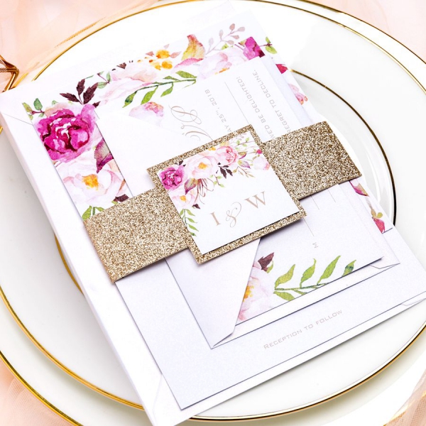 Blush pink floral wedding invitations with gold glitter belly band WS053