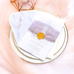 Simple vellum invitation features mauve watercolor design and matching foil names. We fall for the mild and mysterious tone of light purple, translating a comfort and elegant theme for any season. The irregular watercolor very much imitates the outline of the sea, and we seem to hear the tweet of the seagulls. Not only suits summer, you could apply this enchanting invite for every season with mild hue.
