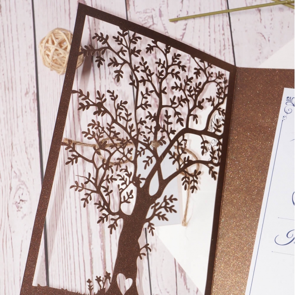 This delicate tree-shaped laser cut invite features hollow heart detail. We like the natural and Boho-style it translates. The whole invitation is finished with earthy twine and rectangle tag with personalized names of the bride and groom. If you are going to have a rustic wedding in spring and fall, this is your perfect choice, don’t miss out!