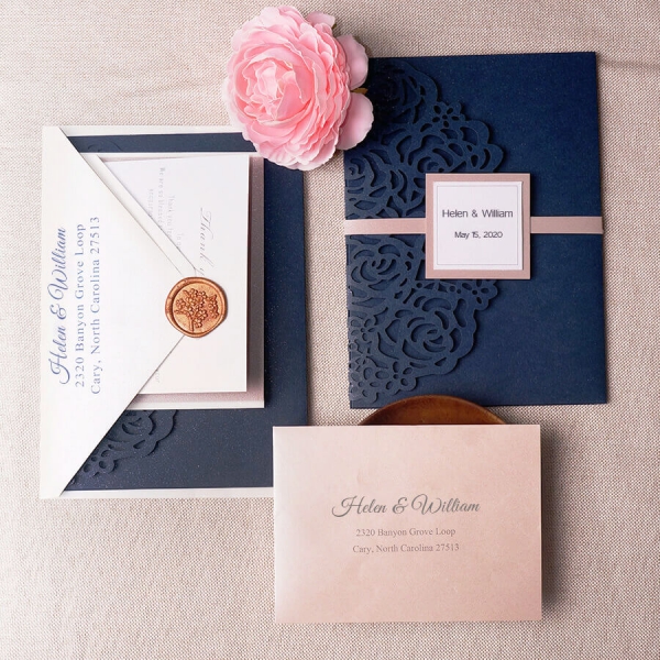 Classic blue and mauve laser cut invites, pocket invites, blush invites, elegant invites, birthday invites, spring, fall, wax seal WS131