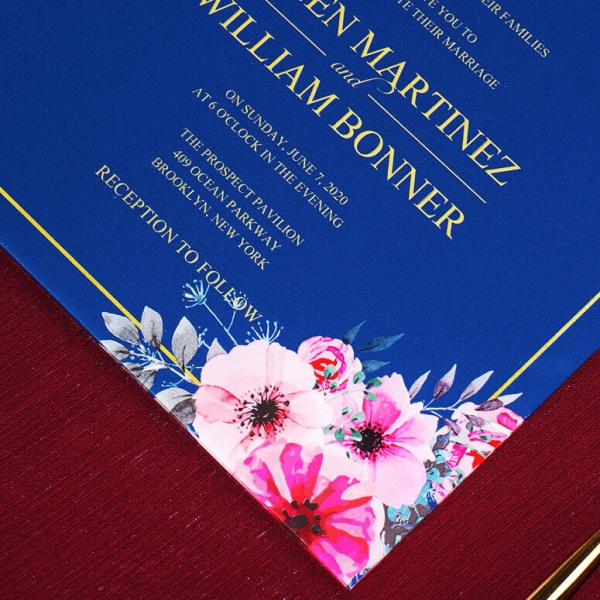 Navy blue and gold acrylic wedding invite with blush watercolor flowers WS193