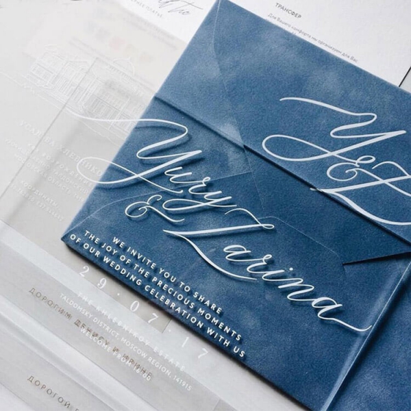 These “7.09 x 4.72” Acrylic Invitations can be mailed in a box or rigid envelope.