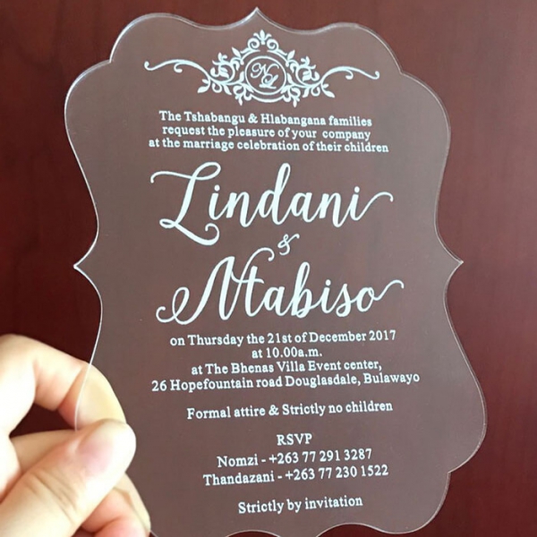 Stunning clear acrylic invitations printed on 1/8” thick acrylic!